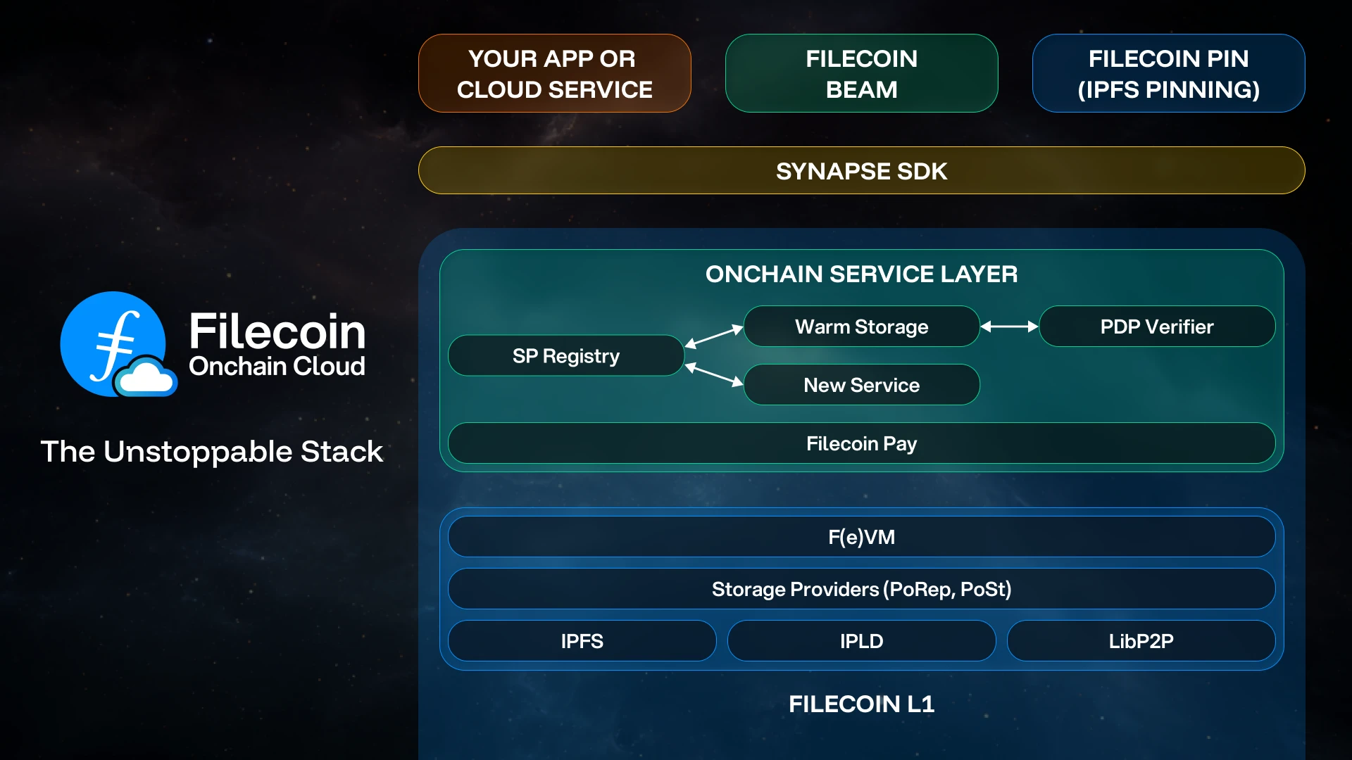 Filecoin Onchain Cloud introduces a cloud platform that provides developers with a decentralized stack built on content-addressed data, fast retrieval, transparent, onchain service delivery, and programmable, verifiable payments. Every interaction –– from storage to retrieval to payment –– is transparent and auditable, offering strong, onchain guarantees. By introducing building blocks like the Filecoin Warm Storage Service, Filecoin Pay, Filecoin Pin, Filecoin Beam, and the Synapse SDK, Filecoin Onchain Cloud lays the foundation for a more open and resilient cloud.